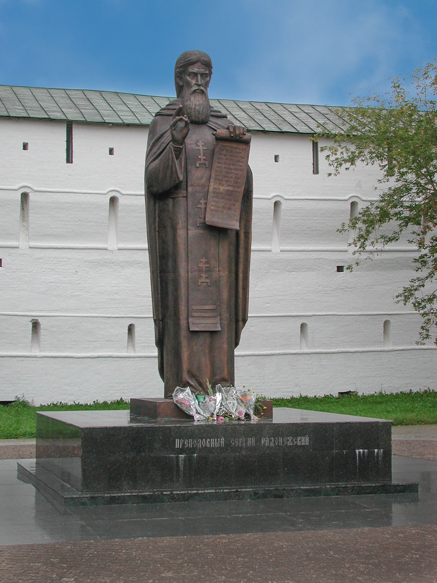- Из ворот поворачиваете налево, проходите мимо памятника Сергию Радонежскому. Он будет своеобразным указателем правильного направления. Прогулка проходит вдоль стены, причем там, где она поворачивает налево, вам тоже нужно свернуть и продолжить шагать вдоль белоснежной ограды.